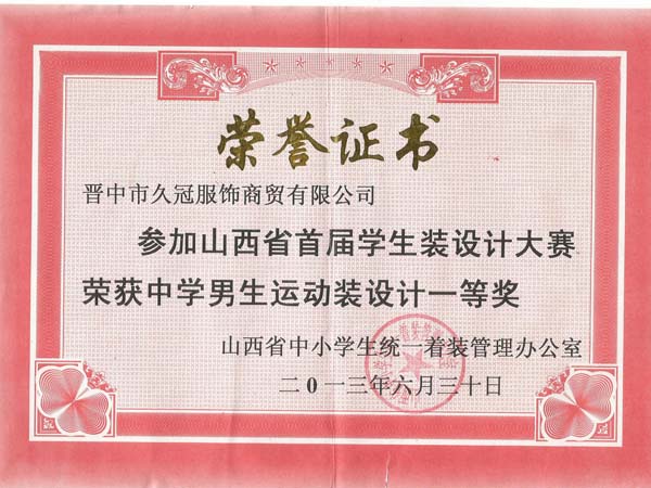 山西久冠服飾有限公司位于晉商故里山西省晉中市。公司注冊商標“久冠”,是山西省教育學會學生服被裝專業委員會會長單位,中國質量萬里行促進會理事單位,中國教育裝備行業協會學校后勤裝備管理分會常務理事單位。